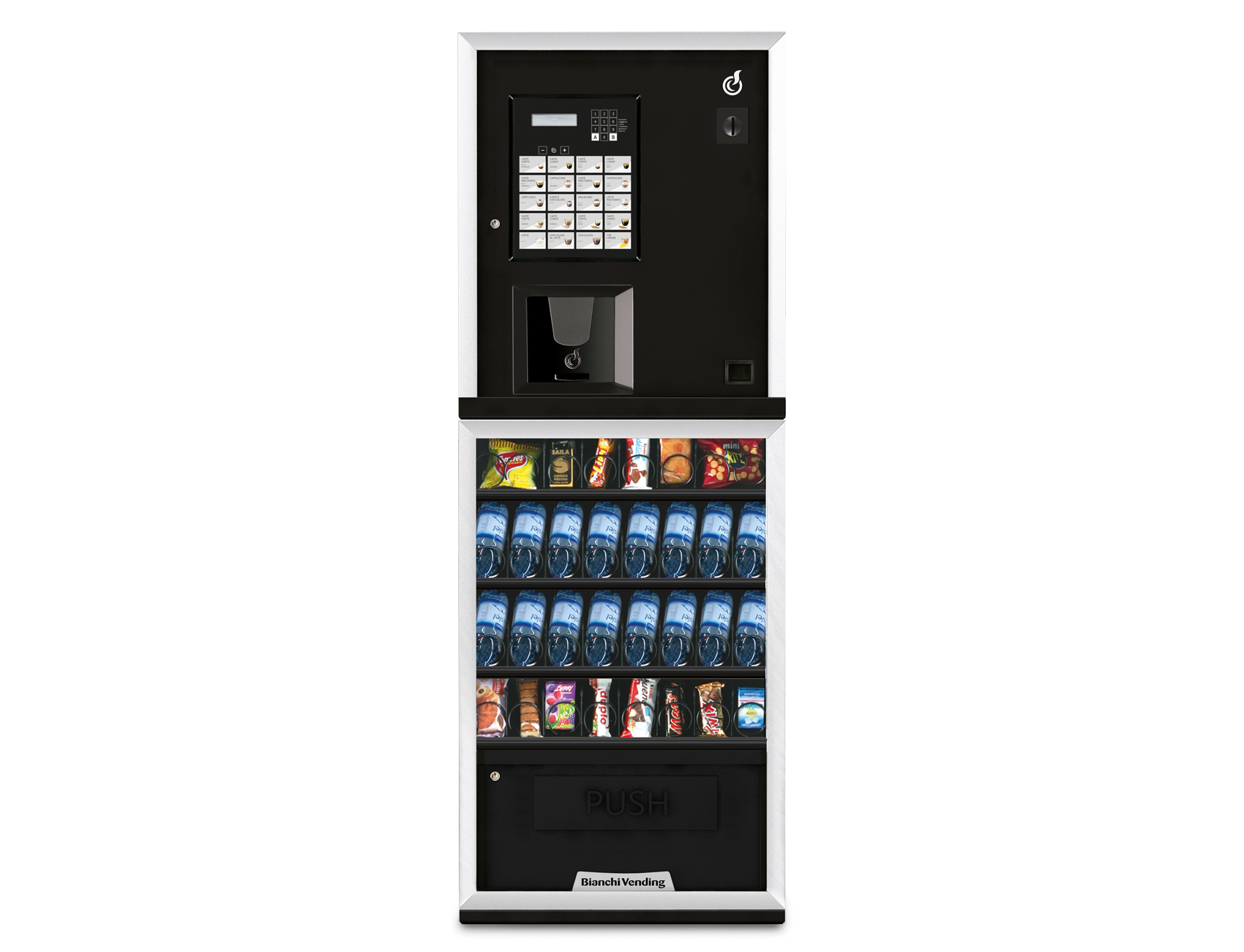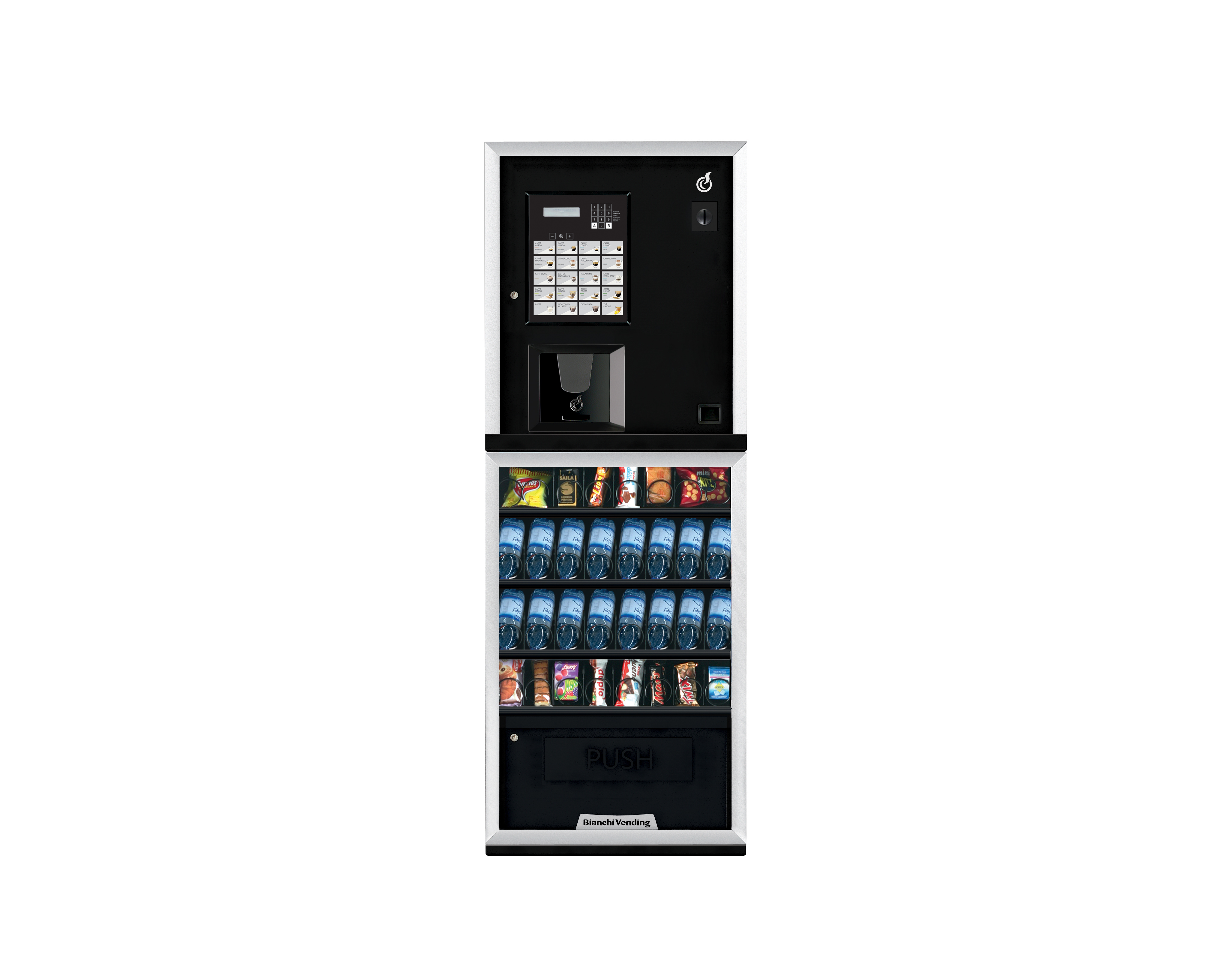 - kit 2 contenitori topping, per offrire bevande calde arricchite da numerosi prodotti di alta qualità, come scaglie di cioccolato, choco pops, muesli, etc. - Ampio vano erogazione ”push” per prodotti di grandi dimensioni.